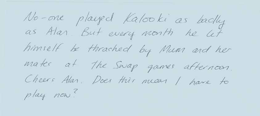 Bring something he may have liked and share memories of Alan on the pieces of paper provided. And choose something from the table that you may not know you needed.